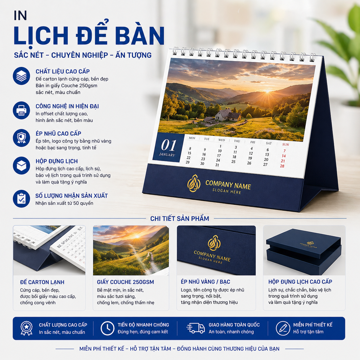- Chất lượng in ấn vượt trội: Chúng tôi sử dụng công nghệ in hiện đại, cùng với các chất liệu cao cấp, đảm bảo hình ảnh sắc nét và màu sắc trung thực, giúp lịch để bàn của bạn trở nên nổi bật và ấn tượng.